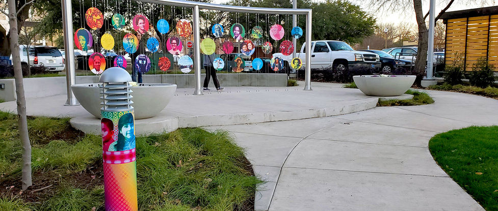 The DWIF Monument reimagines what a historical monument can be. LA-based artist Dina Fisher used lenticular sculptures, decorated bollard lights and a 24-foot-long stainless-steel image curtain displaying 30 colorful discs to create a public space that honors the past and inspires the future.